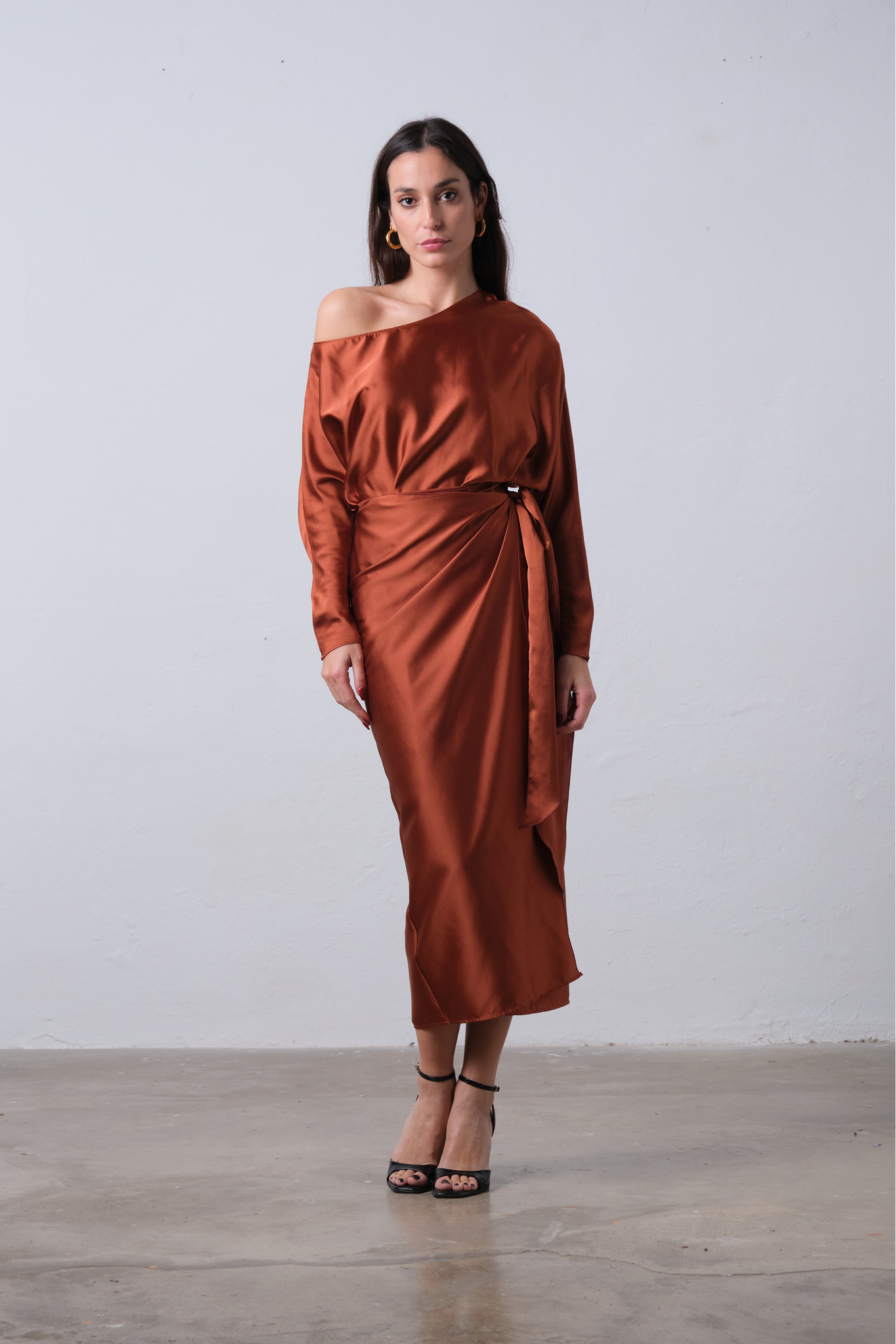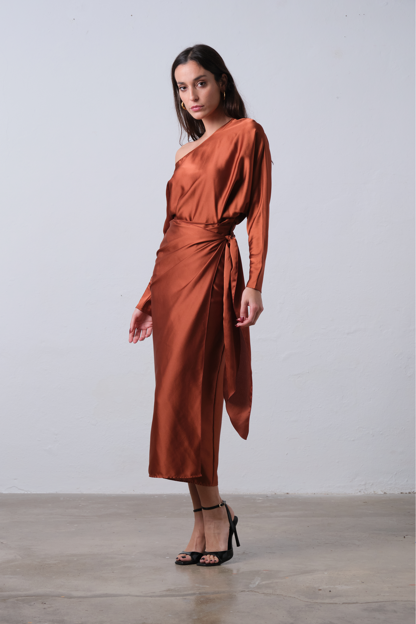 Vestido midi satinado en tono óxido con escote asimétrico y drapeado lateral.